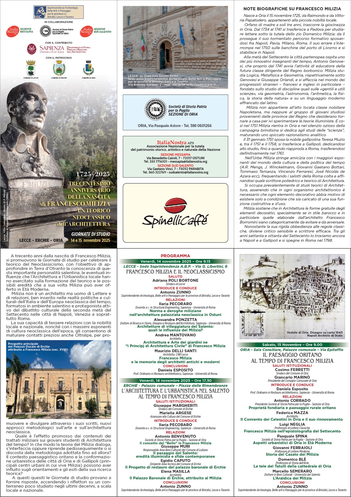 A Trecento anni dalla nascita di Francesco Milizia, si promuovono le giornate di studio per celebrare il teorico del Neoclassicismo, con l'obiettivo di approfondire in Terra D'Otranto la conoscenza di questa importante figura salentina, l'eventuali influenze che l'Architettura e l'Urbanistica locale hanno esercitato sulla formazione del teorico e le possibili eredità che a sua volta Milizia può aver offerto in Età Moderna.
