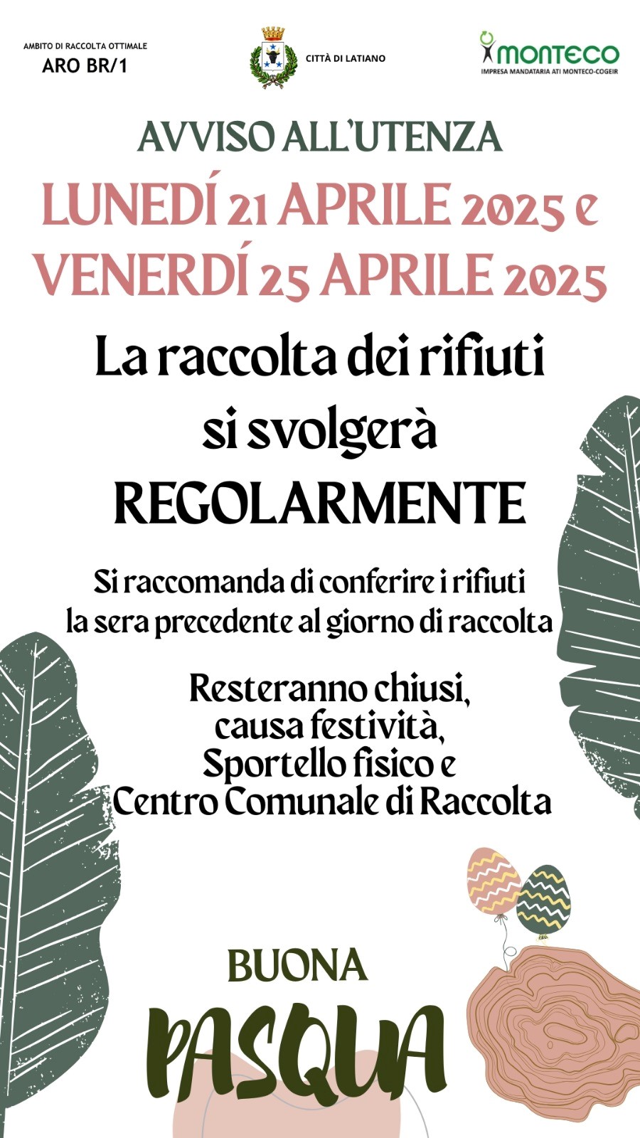 Si comunica che per le giornate del 21 aprile 2025 e 25 aprile 2025, la raccolta dei rifiuti si svolgerà regolarmente.
