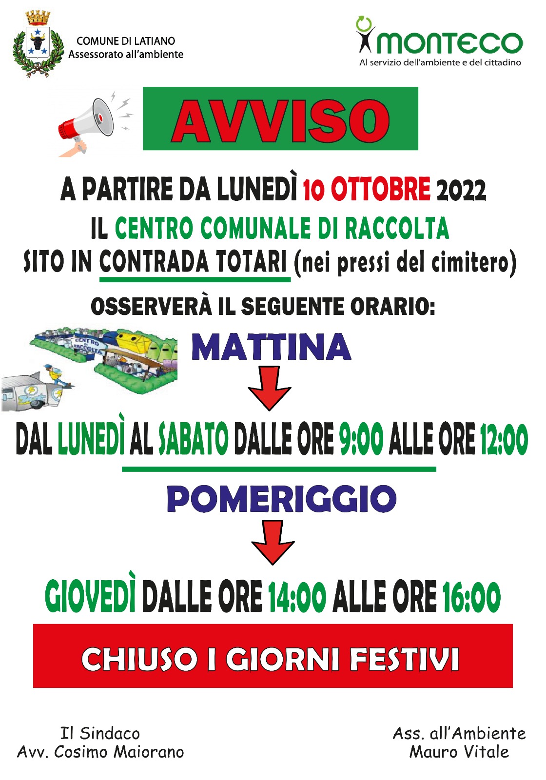 L'Amministrazione Comunale avvisa tutti i cittadini che a partire dal 10 ottobre 2022 il Centro Comunale di Raccolta seguirà il seguente orario: