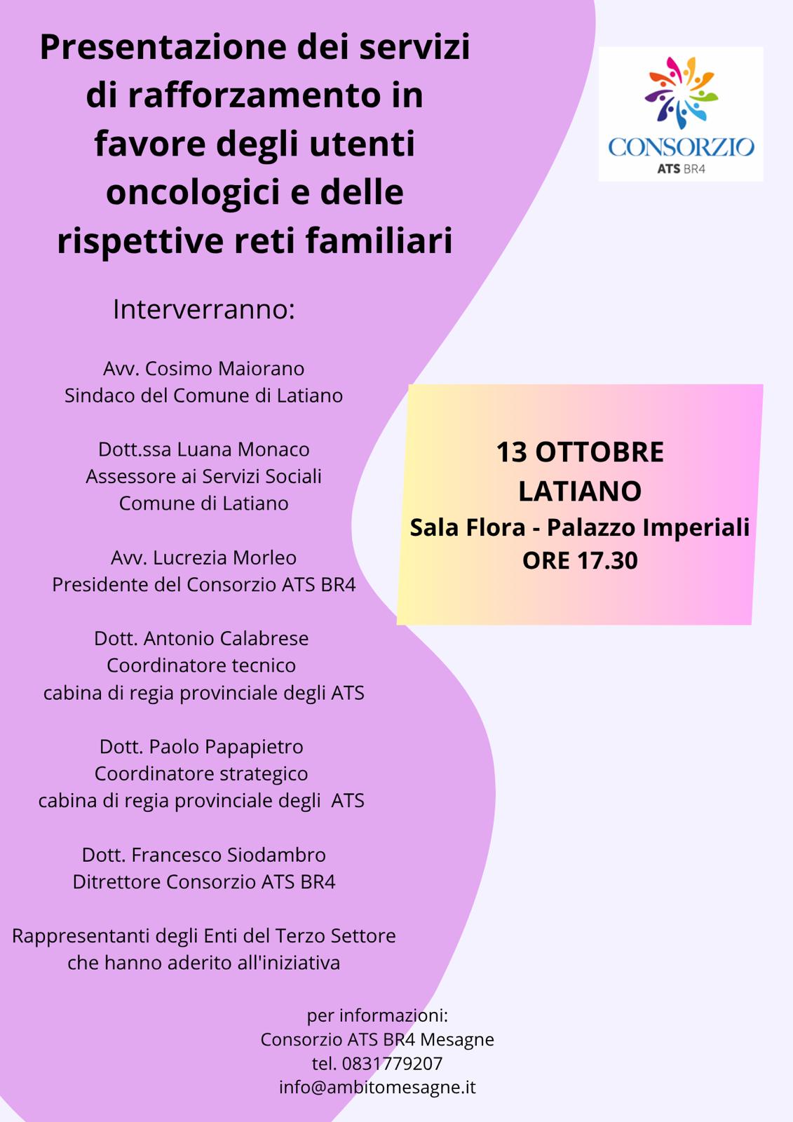 In data 13 ottobre 2025, alle ore 17:30, presso la Sala Flora di Palazzo Imperiali a Latiano, si terrà la presentazione dei servizi di rafforzamento a sostegno degli utenti oncologici e delle loro reti familiari.