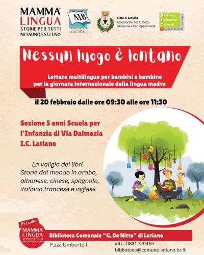 Il Comune di Latiano, attraverso la Biblioteca Innovativa di Comunità "Gilberto De Nitto", in qualità di presidio regionale capofila, organizza una giornata dedicata alla lettura in tante lingue con i libri della sezione Mamma Lingua, con la partecipazione della sezione 5 anni della Scuola per l’Infanzia di Via Dalmazia dell’I.C. Latiano.