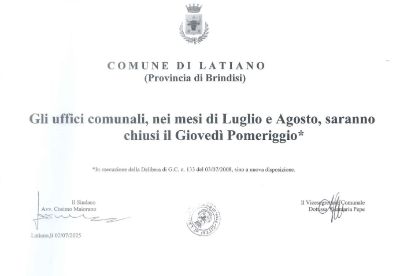 gli Uffici Comunali, nei mesi di Luglio e Agosto, saranno chiusi il Giovedì pomeriggio*