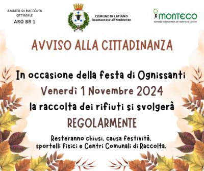 In occasione della festa di Ognissanti, VENERDI' 1 NOVEMBRE, la raccolta dei rifiuti si svolgerà regolarmente