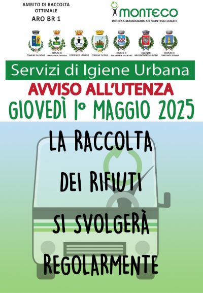 Si comunica che il servizio di raccolta dei rifiuti si svolgerà regolarmente.