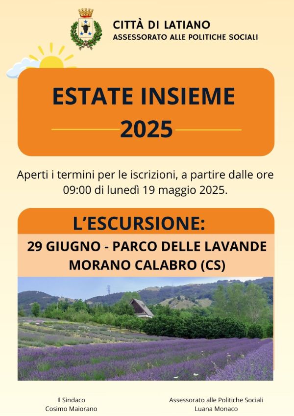 L’Amministrazione Comunale informa la cittadinanza che, a partire dalle ore 09:00 di lunedì 19 maggio 2025, saranno aperti i termini per le iscrizioni all'escursione organizzata dall'Assessorato alle Politiche Sociali del Comune di Latiano, prevista per il 29 giugno 2025 presso il Parco delle Lavande, Morano Calabro (CS).