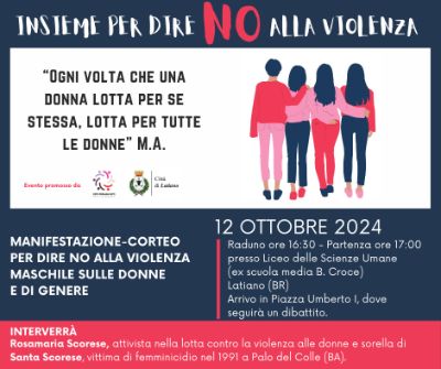 La “Rete permanente contro la violenza di genere”, costituitasi a Latiano su iniziativa dell’Amministrazione Comunale, a cui partecipano i servizi sociali, le forze dell’ordine, i centri antiviolenza del territorio, il collettivo Donne contro la violenza, gli enti del Terzo Settore e le associazioni di volontariato, promuove per SABATO 12 OTTOBRE 2024 alle ore 17.00 UNA MANIFESTAZIONE CON CORTEO PER DIRE NO ALLA VIOLENZA MASCHILE SULLE DONNE E DI GENERE, per mettere in campo azioni di informazione e sensibilizzazione volte al contrasto e alla prevenzione della stessa e per esprimere solidarietà alle vittime.