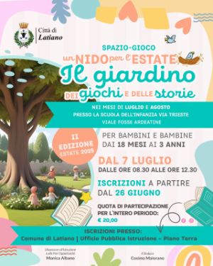Si informa la cittadinanza che, a partire dal 26 giugno 2025, presso l’Ufficio Pubblica Istruzione di questo Ente, sono aperte le iscrizioni per partecipare al servizio PROGETTO SPAZIO GIOCO - Un Nido per l’Estate - "Il Giardino dei Giochi e delle Storie", rivolto ai bambini di età compresa tra 18 e 36 mesi.