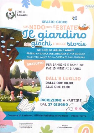 A partire da 27 giugno 2024 presso l'Ufficio Pubblica Istruzione di questo Ente sono aperte le iscrizioni per partecipare al servizio PROGETTO SPAZIO GIOCO "Un Nido per l’estate”, per bambini di età compresa tra i 15 e i 36 mesi.