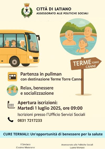 L’Amministrazione Comunale informa la cittadinanza che a partire dal 1 luglio 2025 sarà possibile iscriversi al Servizio trasporto giornaliero presso le Terme di Torre Canne, con servizio di accompagnamento, degli anziani residenti nel Comune di Latiano.