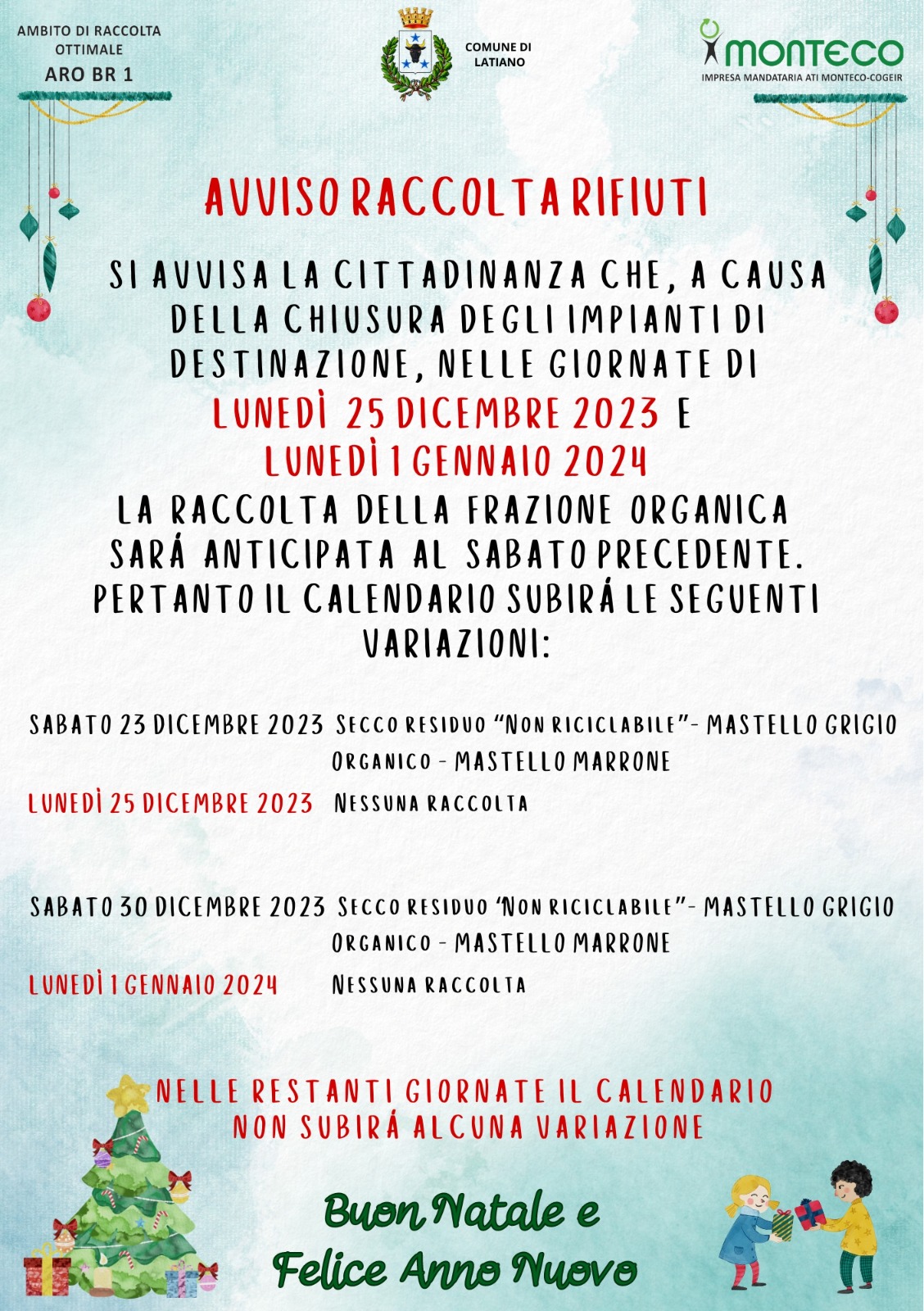 SABATO 23 DICEMBRE non riciclabile (mastello grigio) Oragnico (mastello marrone)