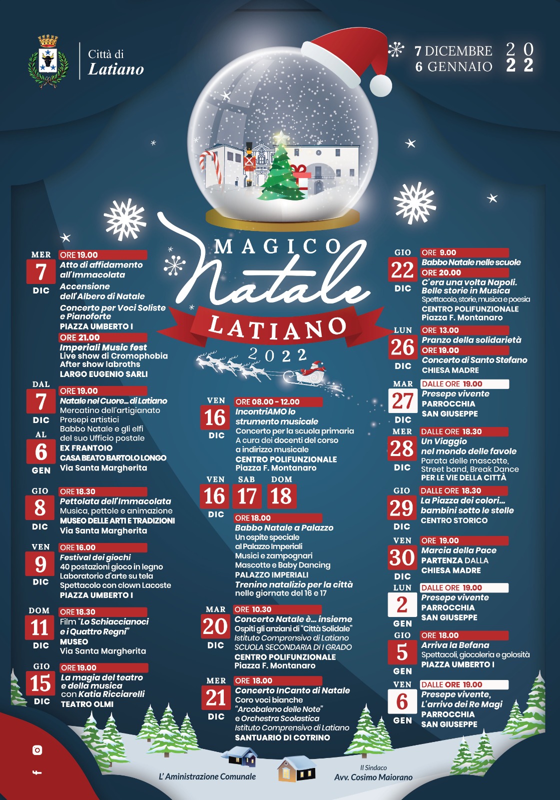 Un programma condiviso con le Istituzioni ecclesiastiche e scolastiche, con le associazioni del territorio, gli artisti e i giovani. Un programma che dedica grande attenzione nei confronti delle bambine e dei bambini e volge uno sguardo particolare alle famiglie, nel segno della solidarietà e della condivisione. Un filo rosso percorre l'intero programma: la musica, magia del Natale.