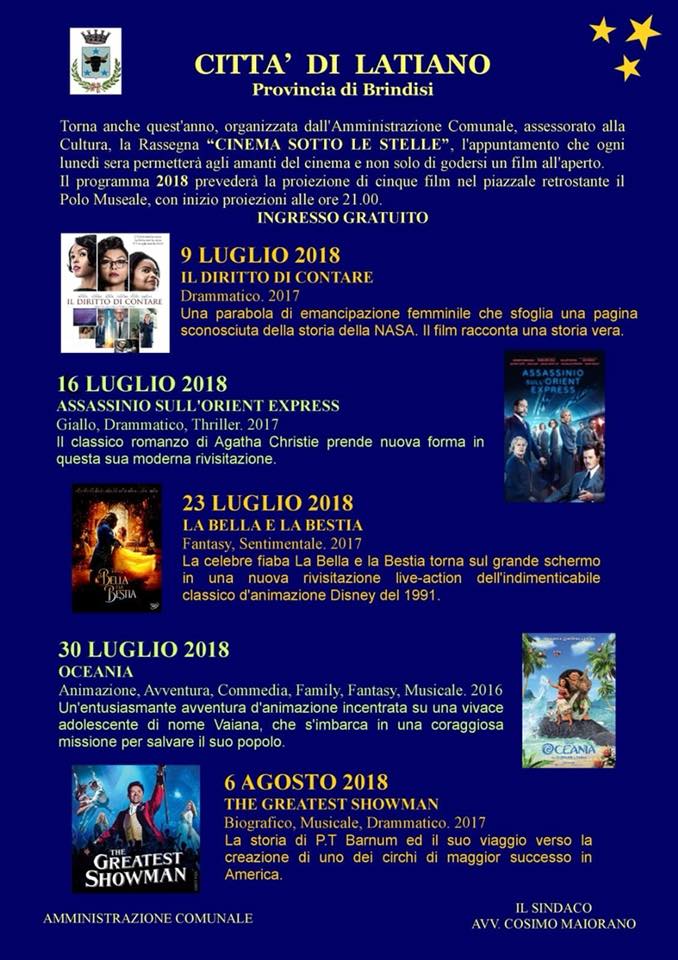 Torna anche quest'anno, organizzata dall'Amministrazione Comunale, assessorato alla Cultura, la Rassegna "CINEMA SOTTO LE STELLE", l'appuntamento che ogni lunedì sera permetterà agli amanti del cinema e non solo di godersi un film all'aperto. Il programma 2018 prevederà la proiezione di cinque film nel piazzale retrostante il Polo Museale, con inizio proiezioni alle ore 21.00. INGRESSO GRATUITO