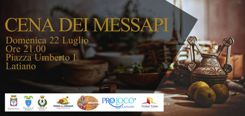 l'associazione con la PRO LOCO di Latiano e il Comitato Festa Patronale Santa Margherita, con il patrocinio dell'Amm.ne Comunale, della Provincia di Brindisi e della Regione Puglia, organizza la CENA DEI MESSAPI. Per una notte Piazza Umberto I si trasformerà in una "camera da pranzo" a cielo aperto, un modo collettivo per stare insieme, per condividere emozioni, cibo,buon umore; un'occasione per divertirsi insieme, scoprire la cultura e i sapori del nostro territorio. Il cittadino che intende partecipare può contattare i nn.: 3289419824 - 3384256297 - 3479367437 - 3488987677 - 3933326157