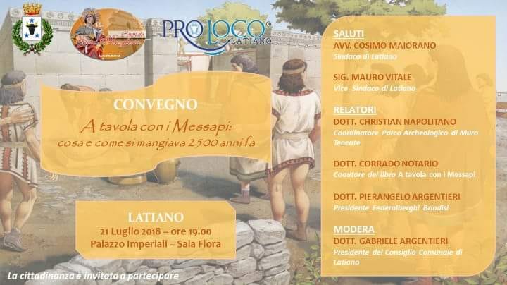 del Sindaco Cosimo Maiorano e del presidente del Consiglio Comunale di Latiano, Gabriele Argentieri, prevede l’intervento del Dott. Corrado Notario, archeologo e Responsabile Scientifico del Museo Diffuso di Cavallino (Lecce) per l’Università del Salento. Il Dott. Notario, autore di una pubblicazione dal titolo A tavola con i Messapi, presenterà un argomento incentrato su “Archeologia ed enogastronomia. Un progetto per uno sviluppo sostenibile del Salento”, durante il quale tratterà dell’importanza che l’archeologia riveste nella scoperta delle tradizioni enogastronomiche del Salento antico, portando alcuni esempi di applicazione nel settore turistico e culturale pugliese.