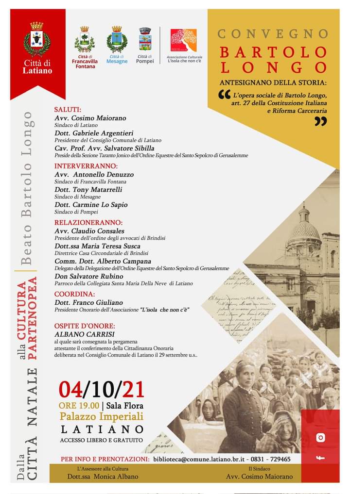 informano che lunedì 4 ottobre 2021 ore 19,00 nella Sala Flora si svolgerà un convegno "Bartolo Longo" dalla Città Natale alla Cultura Partenopea:
