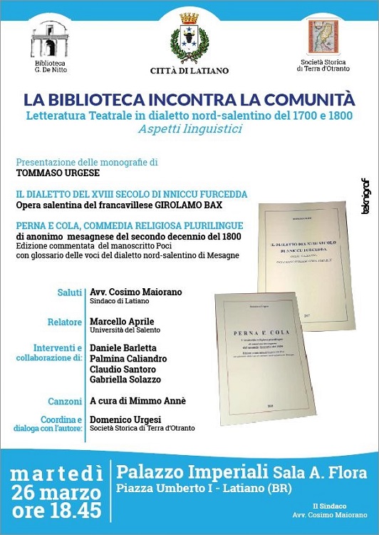 Martedì 26 marzo nella Sala Flora di Palazzo Imperiali a Latiano, piazza Umberto I, si parlerà di due opere teatrali nord-salentine, Nniccu Furcedda di Gerolamo Bax, un’opera carnascialesca, da sempre rappresentata nel periodo di carnevale a Francavilla Fontana , e di Perna e Cola, di autore sconosciuto, un’opera religiosa rappresentata nel periodo di Natale a Mesagne.