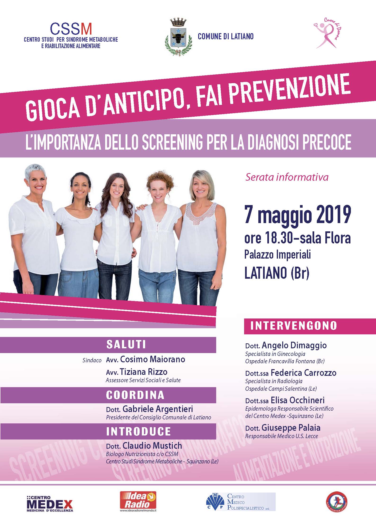 Martedì 7 maggio 2019 alle ore 18,30 nella "Sala Flora" presso Palazzo Imperiali, l'Amministrazione Comunale, il Centro Studi Sindrome Metaboliche -Squinzano, l'Associazione "Cuore di Donna" Sez. di Brindisi, organizzano una serata informativa su PREVENZIONE E IMPORTANZA DELLO SCREENING NELLA DIAGNOSI PRECOCE DEI TUMORI.