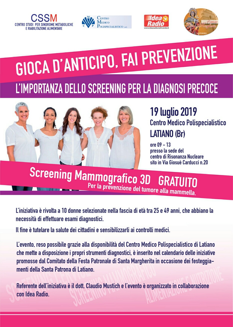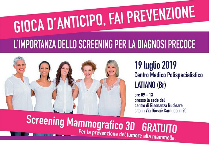 Venerdì 19 Luglio 2019 dalle ore 9:00 alle ore 13:00 presso la sede del Centro di Risonanza Nucleare in Via Giosuè Carducci, 20 a Latiano uno Screening Mammografico 3D gratuito per la PREVENZIONE del Tumore alla Mammella.
