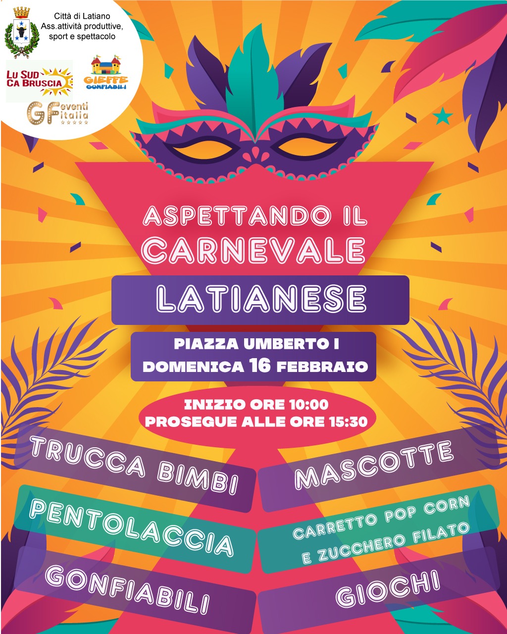 Eventi sul territorio Pubblicato: 14 Febbraio 2020 Scritto da Sig. Concetta Nicolì Visite: 2057 Stampa Condividi Facebook Twitter Whatsapp Telegram Email Aspettando il Carnevale Aspettiamo tutti i bambini Domenica 16 febbraio ore10:00 in Piazza Umberto