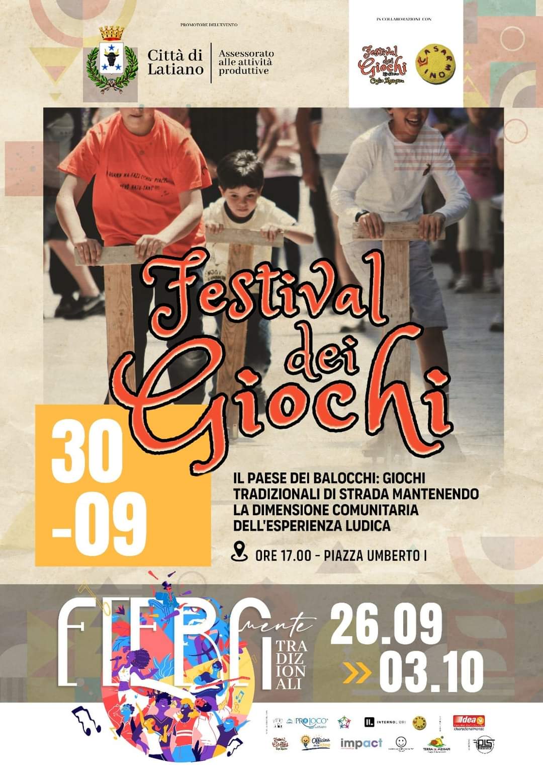 prevista dal 26 settembre al 3 ottobre 2021 si è organizzato il "FESTIVAL DEI GIOCHI" . Il Paese dei Balocchi: Giochi tradizionali di strada mantenendo la dimensione comunitaria dell'esperienza ludica. GIOVEDI' 30 SETTEMBRE 2021 ORE 17.00 PIAZZA UMBERTO I