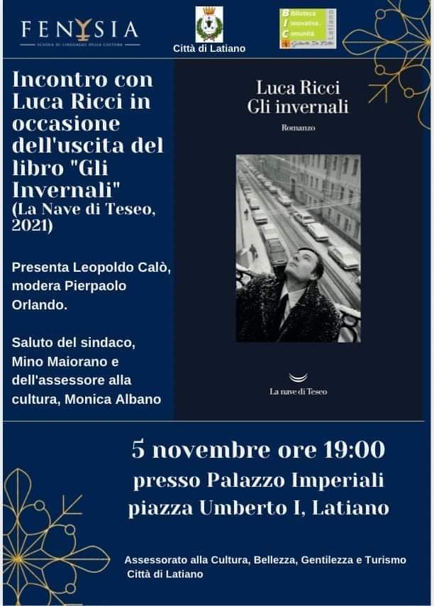 Venerdì 5 novembre alle ore 19.00, dopo la lezione tenuta dall'autore, presso Biblioteca Innovativa di Comunità "Gilberto De Nitto", Leopoldo Calò presenterà il terzo libro della “Quadrilogia delle stagioni” di Luca Ricci: 𝘶𝘯𝘢 𝘴𝘵𝘰𝘳𝘪𝘢 𝘥𝘢𝘭 𝘳𝘪𝘵𝘮𝘰 𝘪𝘯𝘥𝘪𝘢𝘷𝘰𝘭𝘢𝘵𝘰, 𝘳𝘪𝘤𝘤𝘢 𝘥𝘪 𝘥𝘪𝘢𝘭𝘰𝘨𝘩𝘪, 𝘤𝘩𝘦 𝘴𝘤𝘢𝘷𝘢 𝘯𝘦𝘭𝘭𝘦 𝘳𝘢𝘨𝘪𝘰𝘯𝘪 𝘱𝘪𝘶̀ 𝘱𝘳𝘰𝘧𝘰𝘯𝘥𝘦 𝘤𝘩𝘦 𝘮𝘶𝘰𝘷𝘰𝘯𝘰 𝘨𝘭𝘪 𝘶𝘰𝘮𝘪𝘯𝘪 𝘦 𝘭𝘦 𝘥𝘰𝘯𝘯𝘦 𝘥𝘦𝘭 𝘯𝘰𝘴𝘵𝘳𝘰 𝘵𝘦𝘮𝘱𝘰…