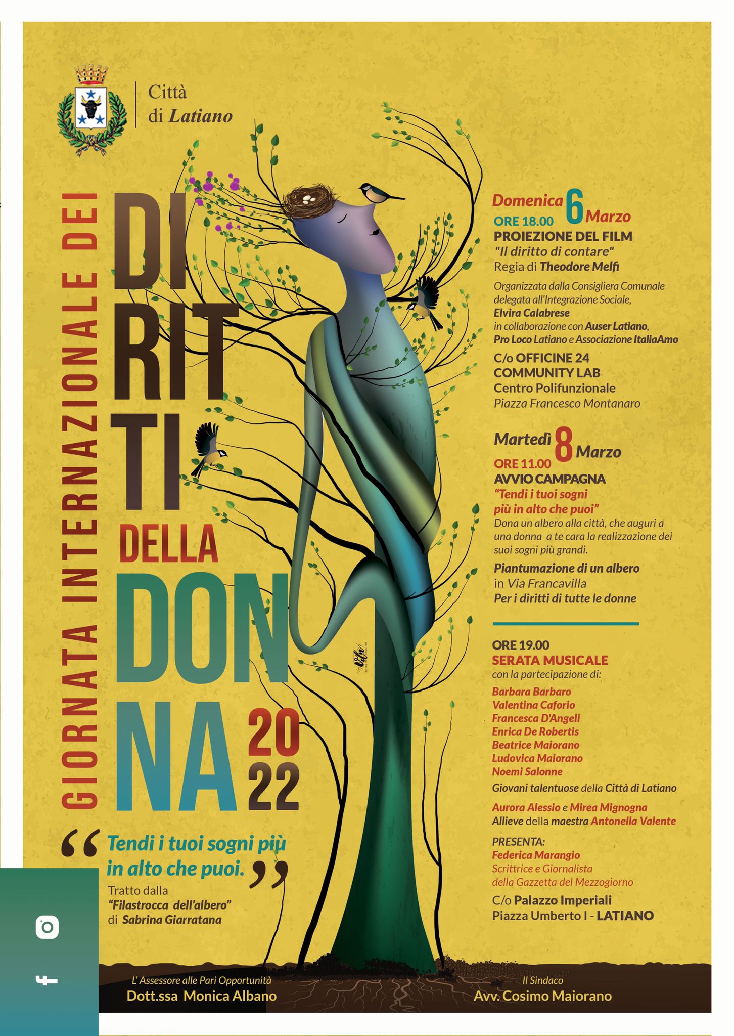 ore 19.00, presso il Palazzo Imperiali in piazza Umberto I, si terrà una serata musicale, condotta dalla scrittrice e giornalista della Gazzetta del Mezzogiorno, Federica Marangio, in cui giovani talentuose latianesi, protagoniste nelle loro specialità, celebreranno la forza delle donne: Barbara Barbaro, Valentina Caforio, Francesca D'Angeli, Enrica De Robertis, Beatrice e Ludovica Maiorano, Noemi Salonne oltre ad Aurora Alessio e Mirea Mignogna (allieve della maestra Antonella Valente).