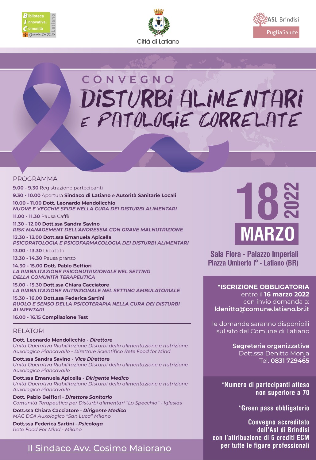Venerdì 18 marzo 2022 con inizio ore 9.00 fino alle ore 16.15 al Convegno DISTURBI ALIMENTARI E PATOLOGIE CORRELATE"
