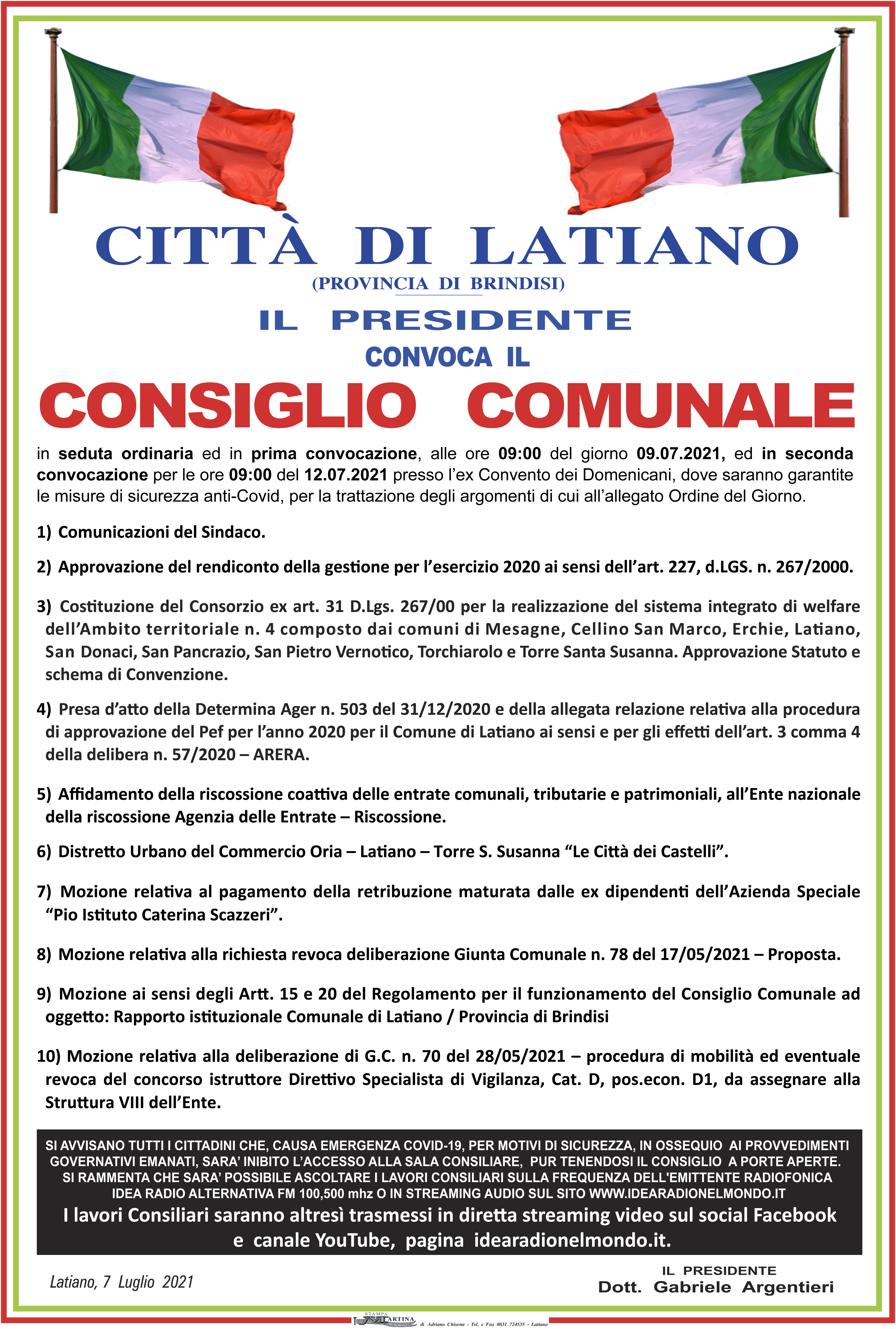 Venerdì 9 luglio 2021 ore 9,00 prima convocazione è convocato il Consiglio Comunale