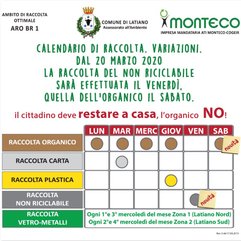 L'Amministrazione Comunale informa che a partire da Venerdì 20 marzo la raccolta della frazione organica sarà effettuata il Sabato mentre la raccolta della frazione non riciclabile sarà effettuata il Venerdì.