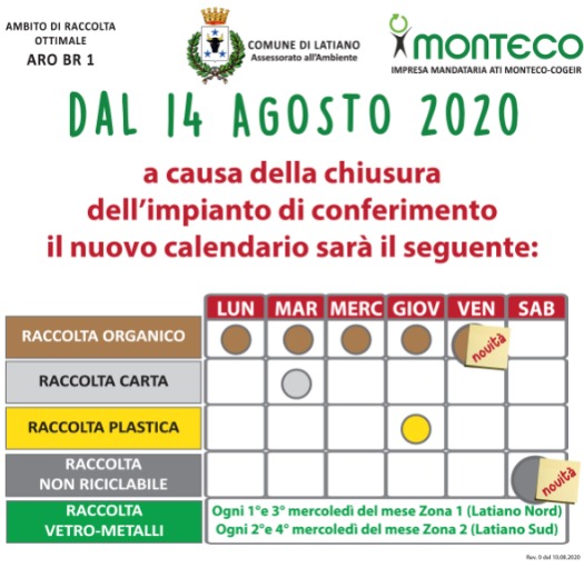 L'Amministrazione Comunale informa che, a causa delle chiusura dell'impianto di conferimento, a partire da Venerdì 14 Agosto la raccolta della frazione organica sarà effettuata il Venerdì mentre la raccolta della frazione non riciclabile sarà effettuata il Sabato.
