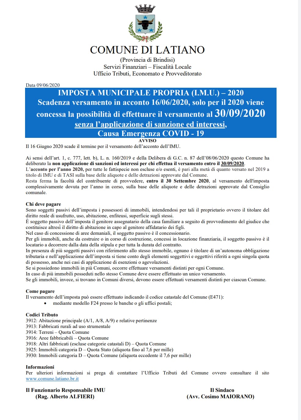 Con delibera n. 87 dell' 08/06/2020, la Giunta Comunale ha stabilito che, a causa delle gravi difficoltà economiche determinate dal COVID-19, il versamento per l'acconto IMU può essere effettuato entro il 30 settembre 2020, senza applicazione di sanzioni ed interessi.